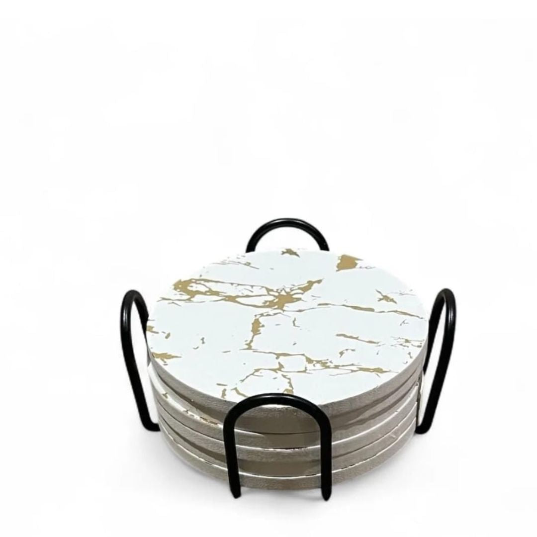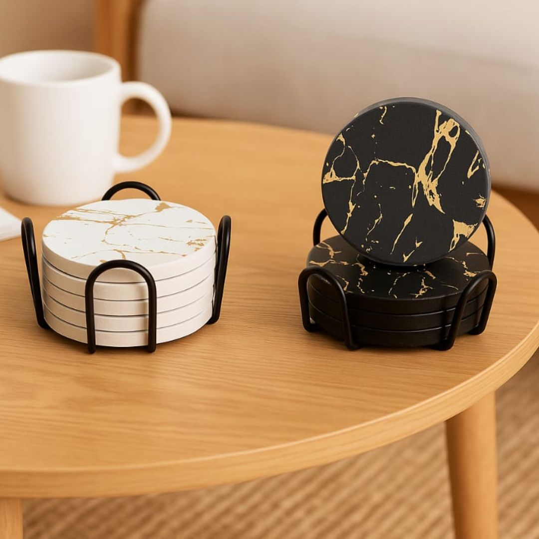 The set comes with a sleek wooden stand for easy storage and display, keeping your coasters organized and accessible whenever needed. Ideal for everyday use or as a thoughtful gift for housewarmings, weddings, or special occasions.