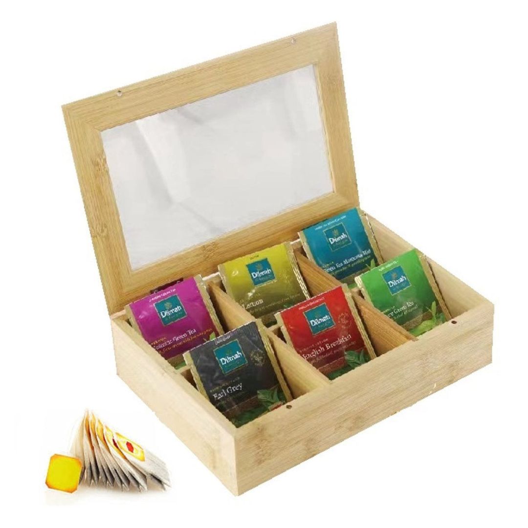 Organize your favorite teas in style with this elegant 6-slot Bamboo Tea Box. Made from high-quality, eco-friendly bamboo, this sleek storage solution keeps your tea bags sorted, fresh, and easy to access. The transparent acrylic lid provides a clear view of your selection while keeping contents protected from dust and moisture.
