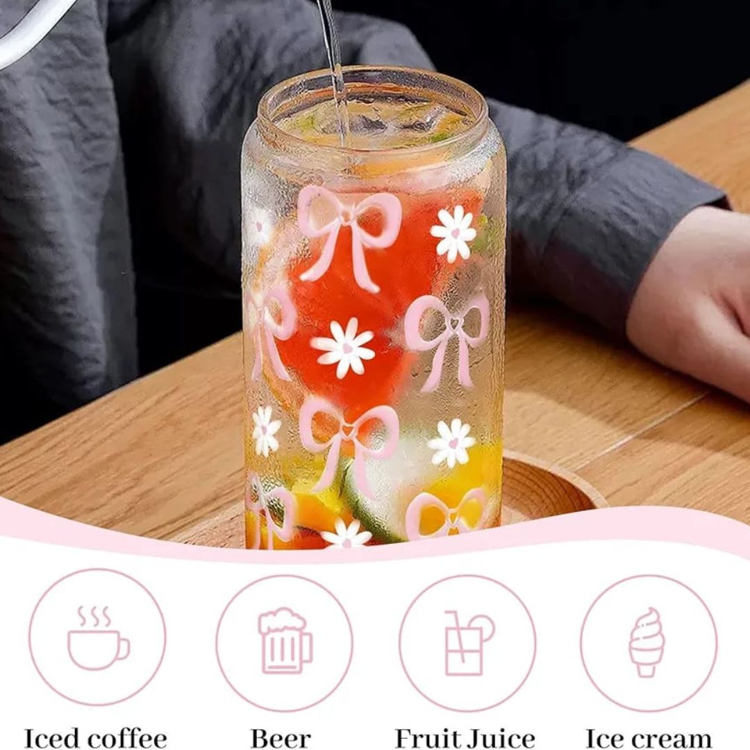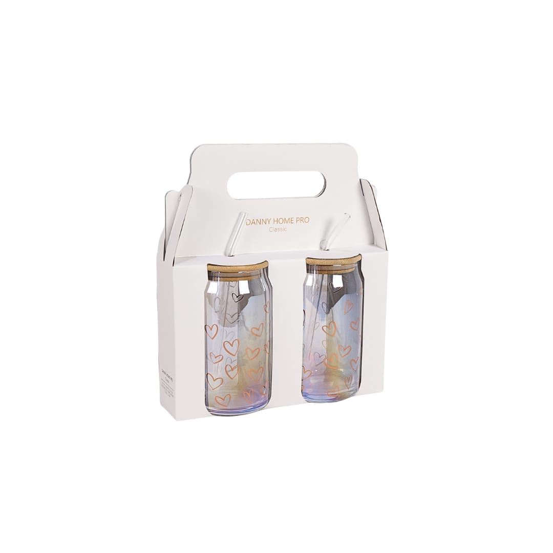 Each set includes two beautifully printed glass cans paired with natural bamboo lids and reusable straws, combining elegance with eco-friendly functionality. The secure bamboo lid helps prevent spills while keeping your drinks fresh, making them ideal for both everyday use and entertaining guests.